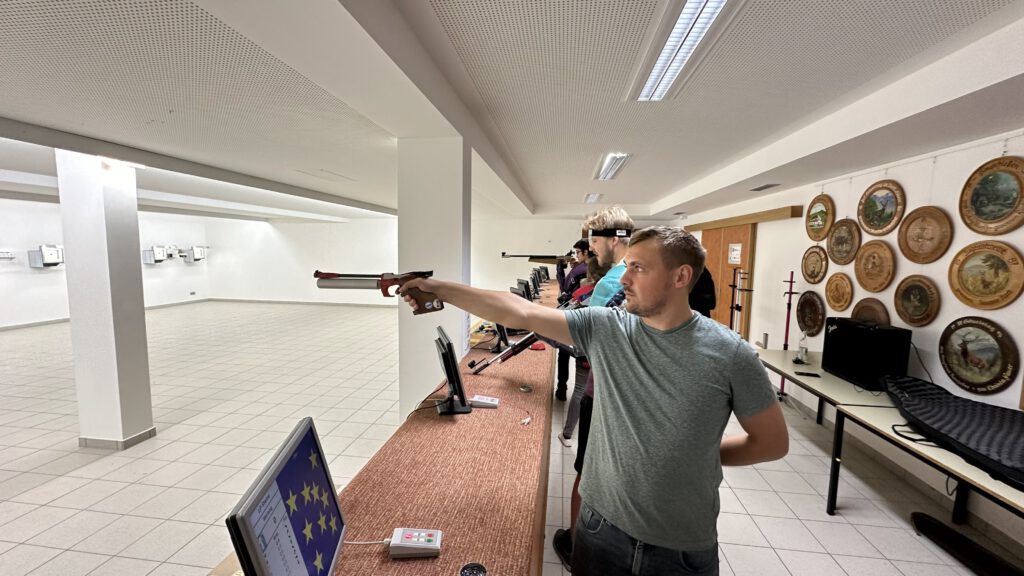 - Stehend frei: Die Pistole wird ohne Stütze mit einer Hand gehalten. Geschossen wird auf eine 10 Meter entfernte Scheibe. Diese Disziplin erfordert Übung, Körperspannung und eine stabile Anschlagsposition.